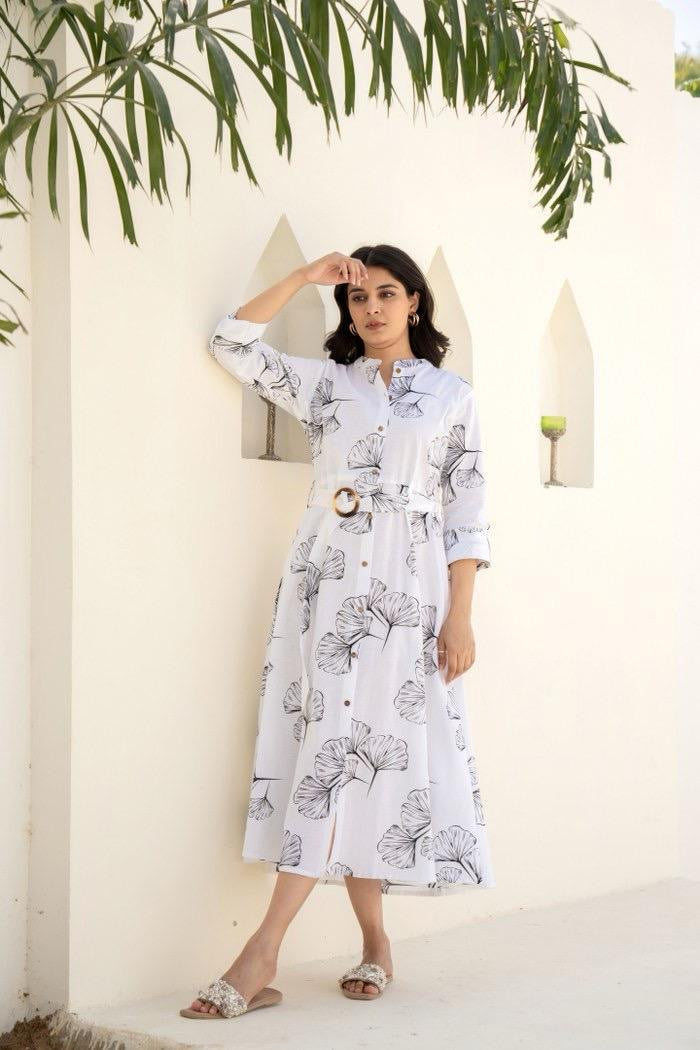 Keep it chic and comfortable in this white printed midi dress adorned with elegant black leaf motifs. Featuring a button-down design, belted waist, and long sleeves, this versatile dress transitions seamlessly from workwear to weekend outings. Pair it with flats for casual days or heels for a polished office look.