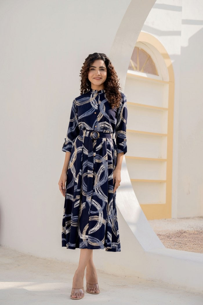 Step into effortless elegance with this navy blue midi dress, adorned with intricate white and beige geometric patterns. Designed to flatter, it features a graceful A-line silhouette, a button-down front, and a matching belt that cinches the waist for a refined fit.