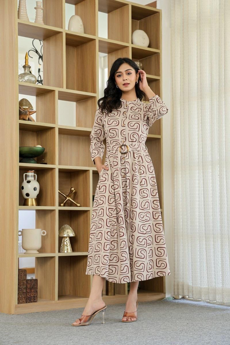 Make a bold fashion statement with our elegant geometric-patterned midi dress. Designed for the modern woman, this dress features a flattering A-line silhouette that enhances your natural curves, while the stylish belt cinches the waist for a polished look. Crafted from premium-quality fabric, it offers both comfort and durability.
