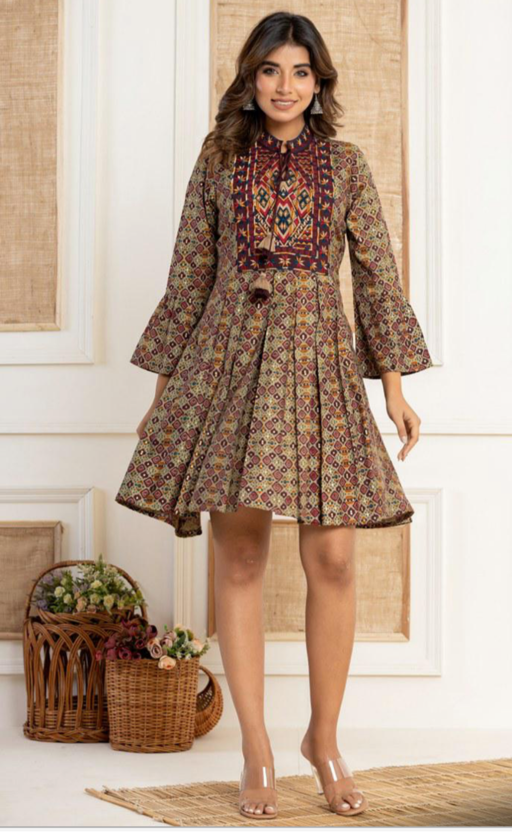 Make a statement in this boho-inspired ethnic short dress crafted with intricate traditional prints in earthy tones. The embroidered yoke with tassel tie-ups adds a festive charm, while the flared pleated hem and bell sleeves give it a modern twist. Perfect as a festive dress, party wear, or casual boho outfit, this versatile piece blends comfort and style effortlessly.