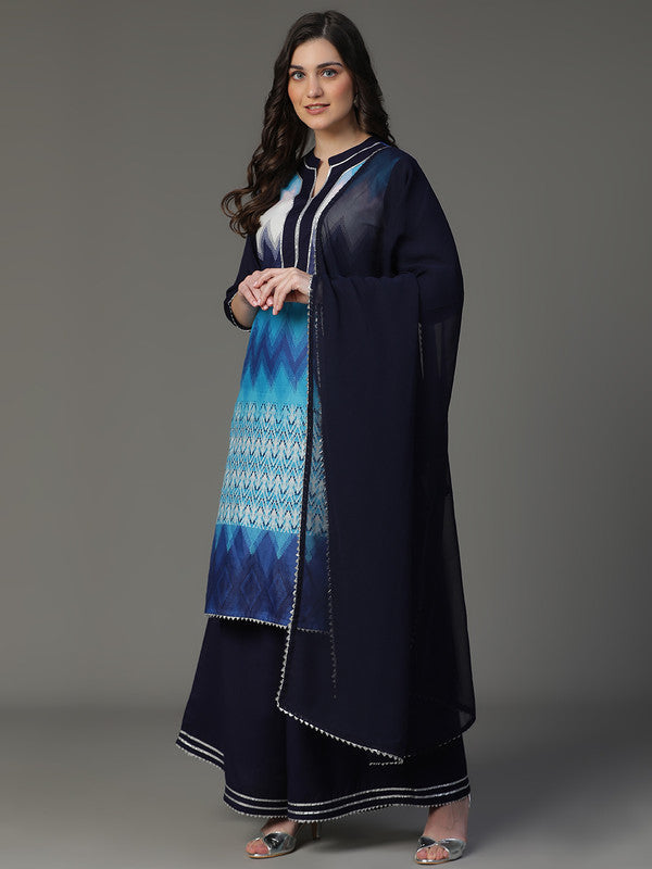 This breathtaking blue dress exudes confidence as it showcases sophisticated elements like a stylish mantle and an elegant cloak. With gracefully tailored sleeves, this ensemble is the perfect reflection of the woman's impeccable fashion sense and personal style. Whether for a special occasion or a night out, this dress is a statement piece that truly showcases her unique flair.