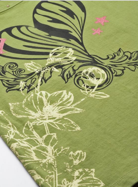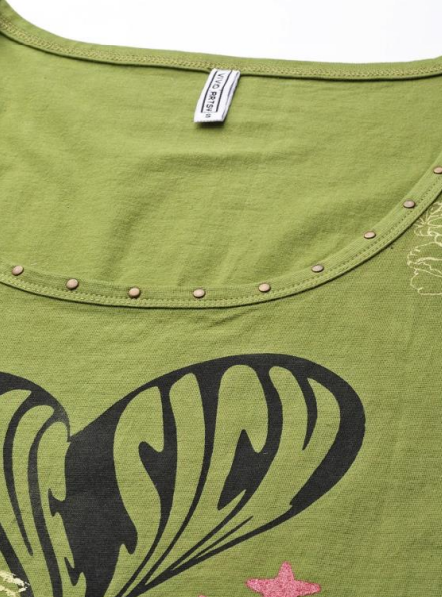 This green T-shirt stands out with its unique design, featuring a rich texture and color complemented by stylish patterns. The fabric showcases intricate details that add depth and elevate the garment’s overall aesthetic. Perfect for those who appreciate fashionable, eye-catching pieces, this T-shirt brings a touch of artistry to casual wear.